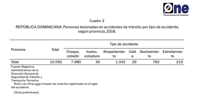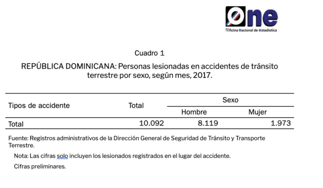 De acuerdo con los datos asentados por la ONE (Oficina Nacional de Estadística) en República Dominicana para inicios del año 2019 se registraron 10,092 casos de personas lesionas en accidentes de tránsito terrestre, de las cuales 8,119 pertenecieron al género masculino y 1,973 a mujeres.